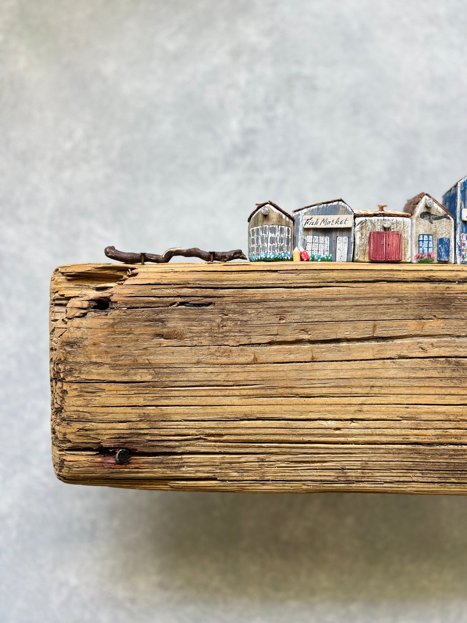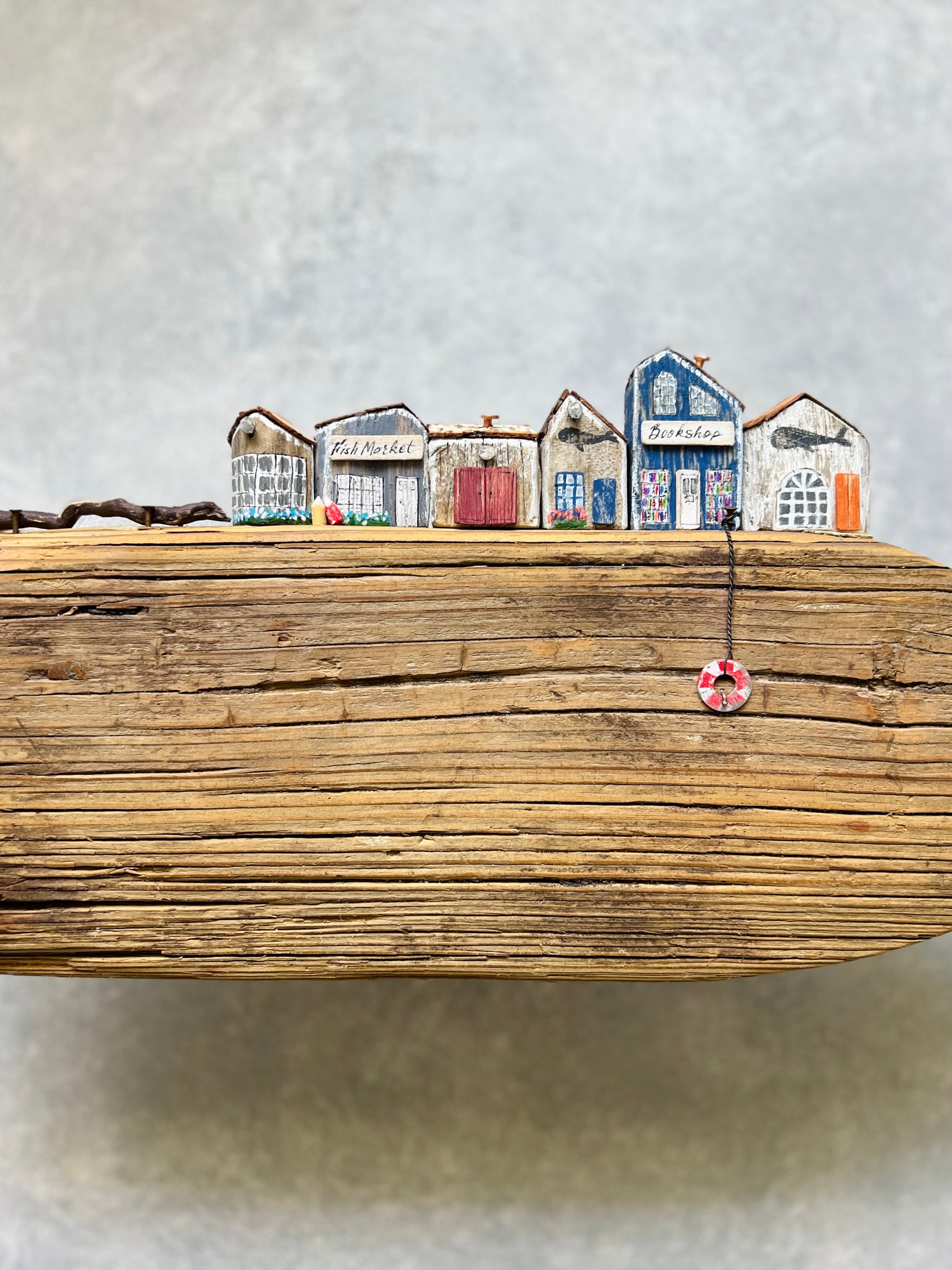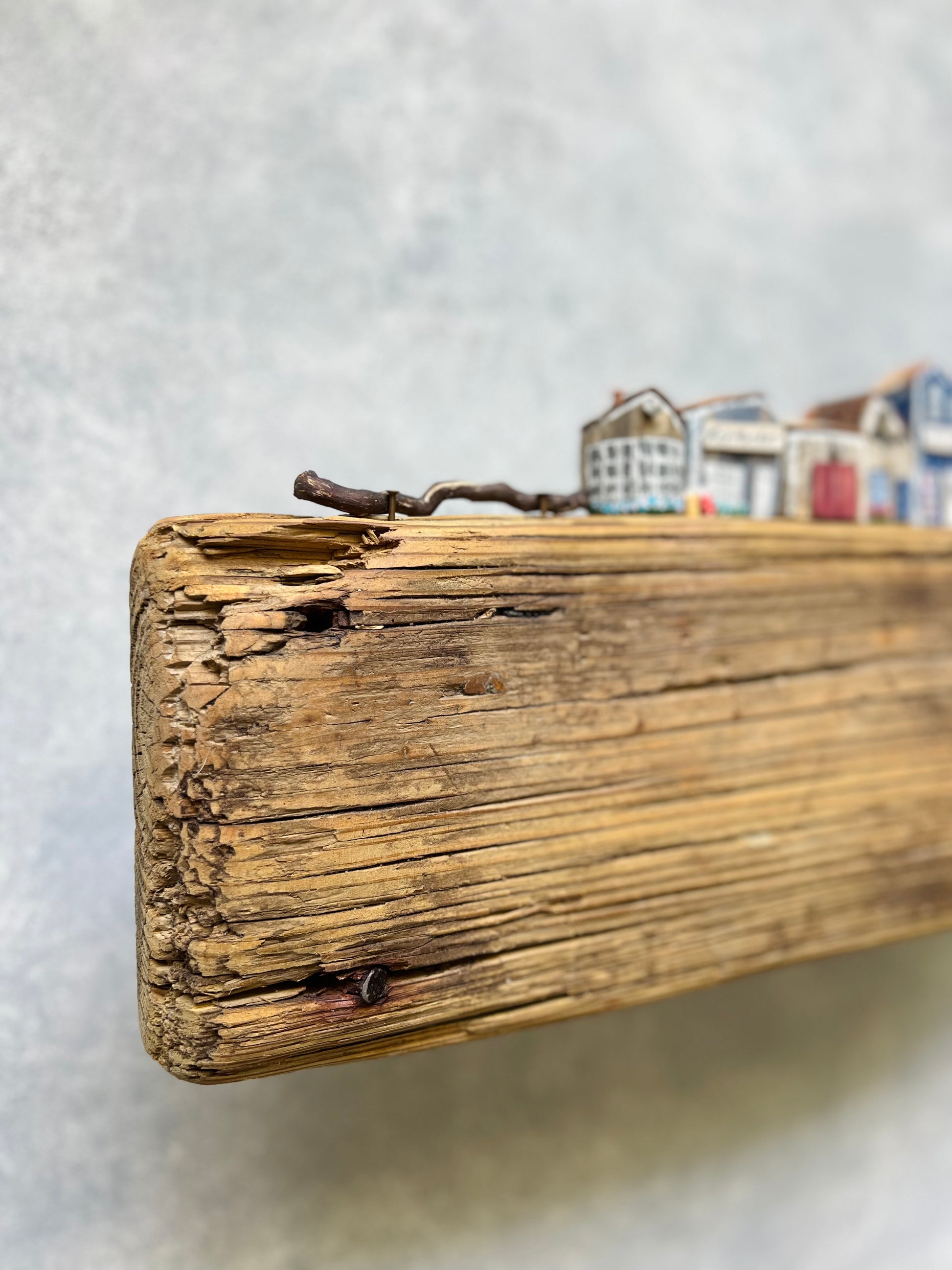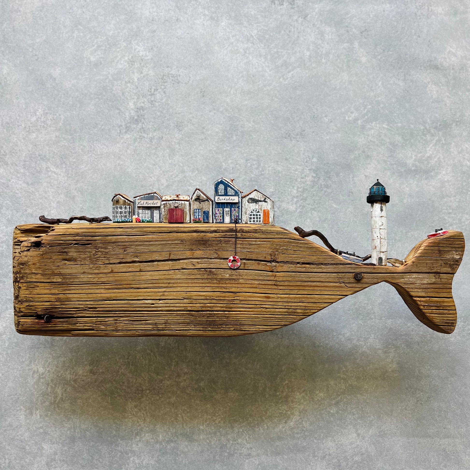 Handcrafted on Cape Cod from locally gathered driftwood, varnished, and waxed. I don’t pre-draw the shape—the driftwood reveals the whale hidden by the ocean. Each piece tells its own story, choosing the perfect lighthouses and houses.