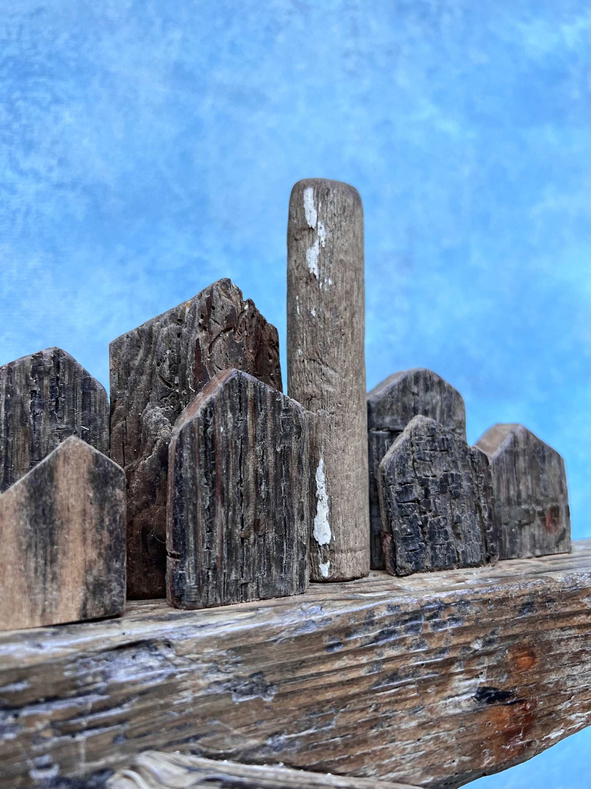 Handcrafted on Cape Cod from locally gathered driftwood, varnished, and waxed. I don’t pre-draw the shape—the driftwood reveals the whale hidden by the ocean. Each piece tells its own story, choosing the perfect lighthouses and houses.