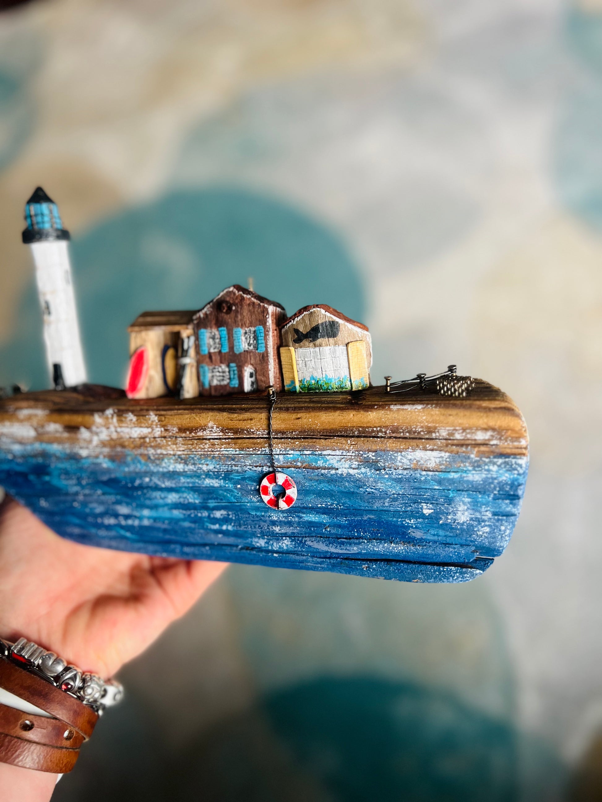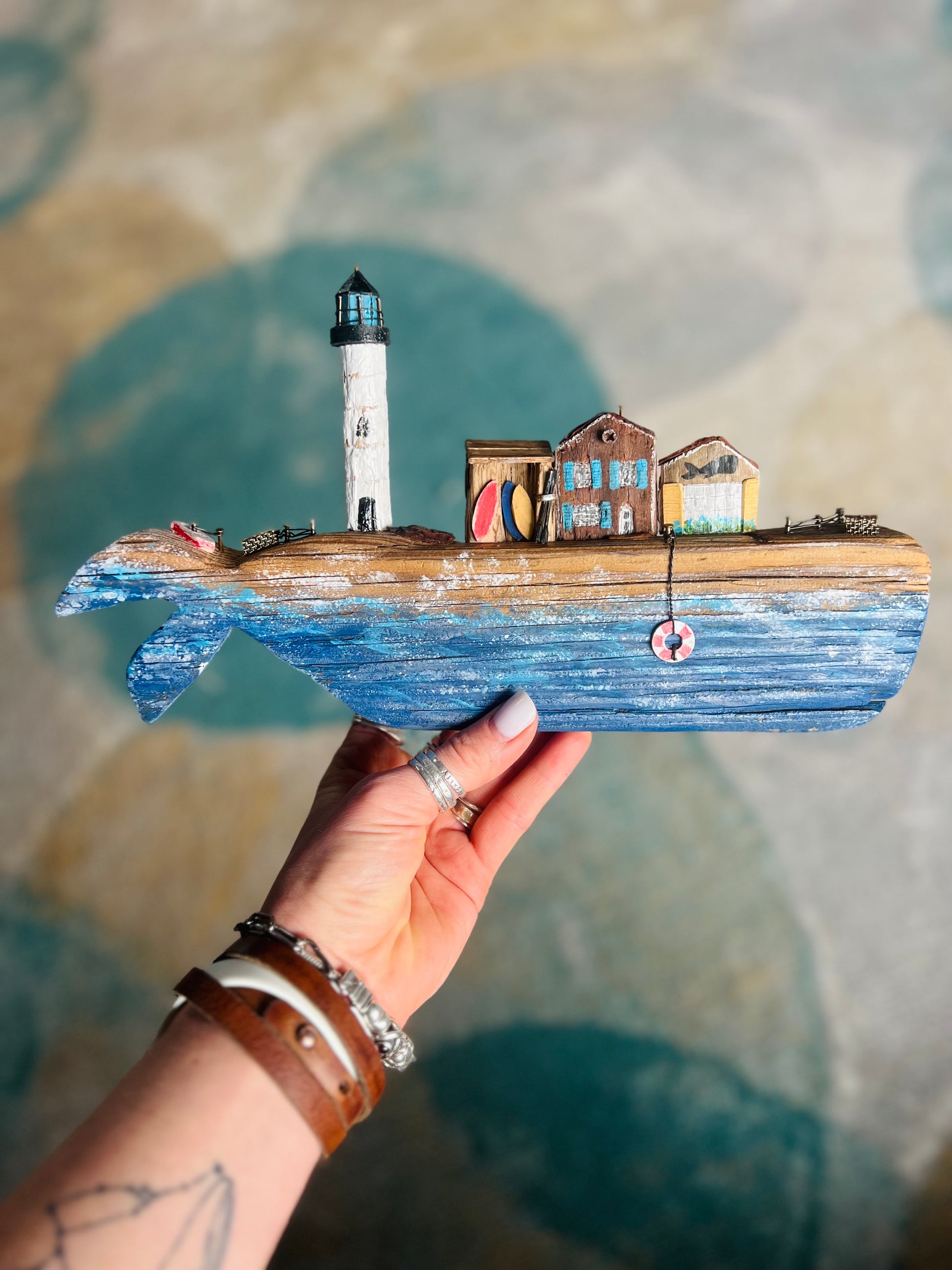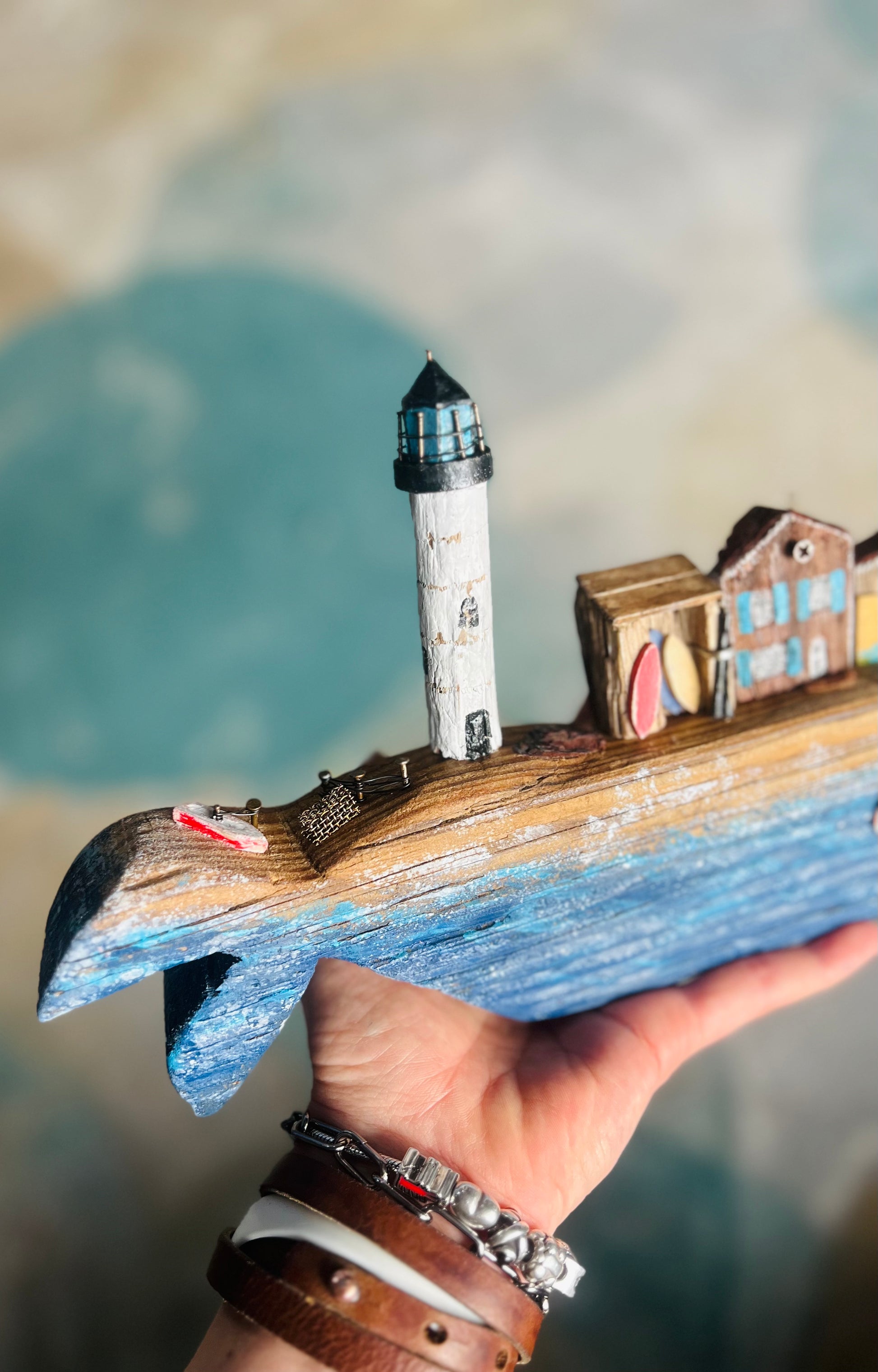 Handcrafted on Cape Cod from locally gathered driftwood, varnished, and waxed. I don’t pre-draw the shape—the driftwood reveals the whale hidden by the ocean. Each piece tells its own story, choosing the perfect lighthouses and houses.
