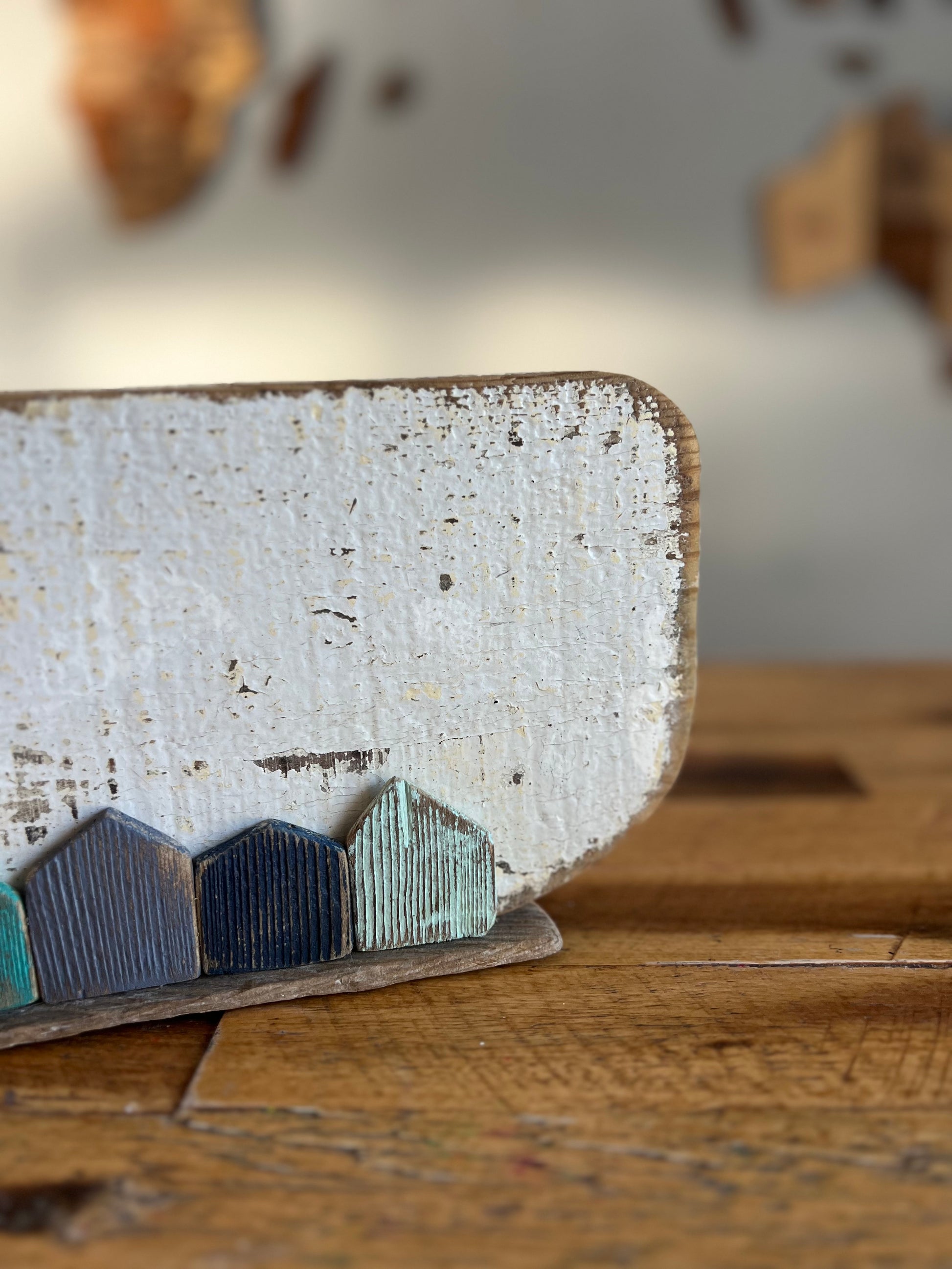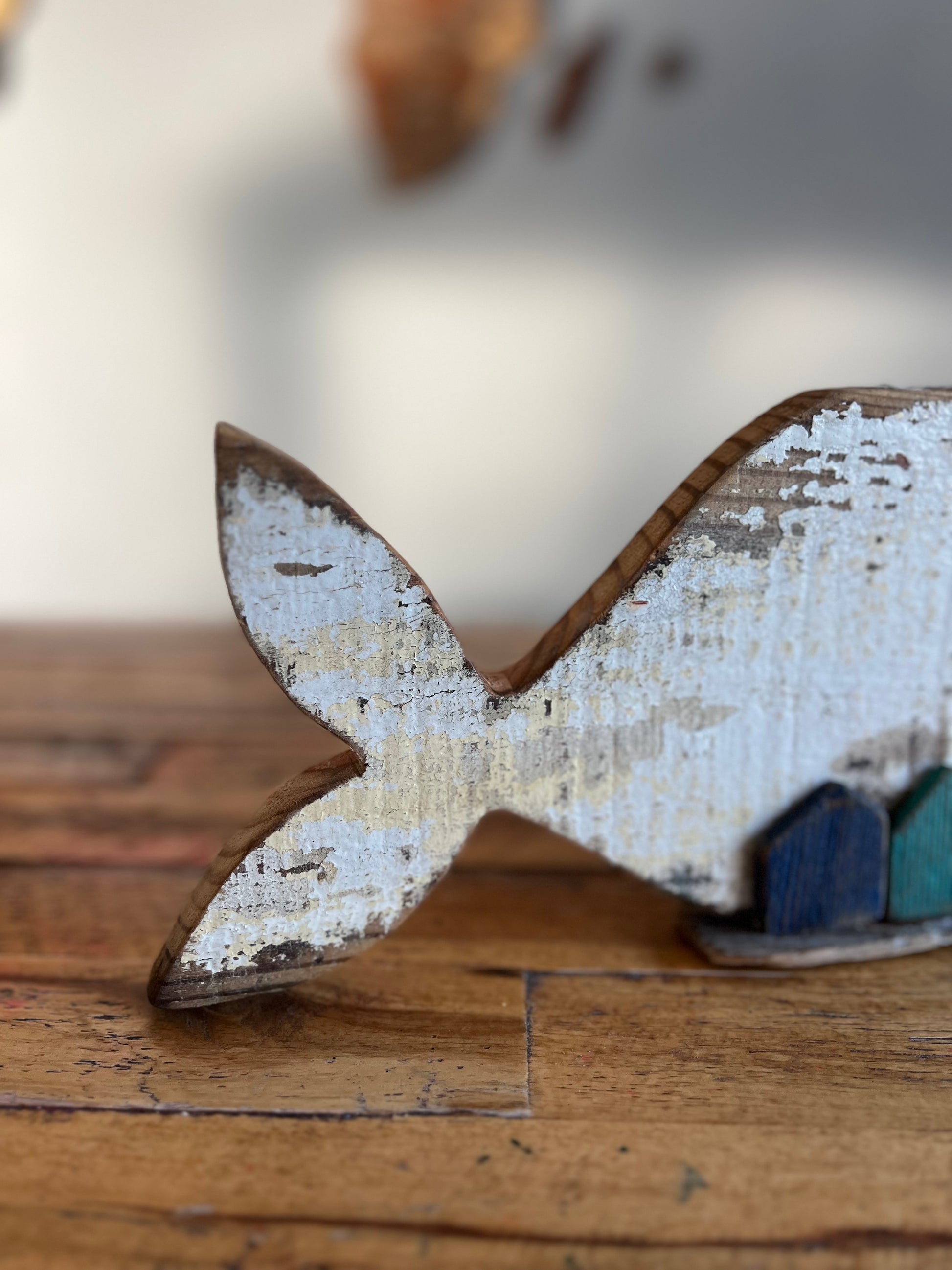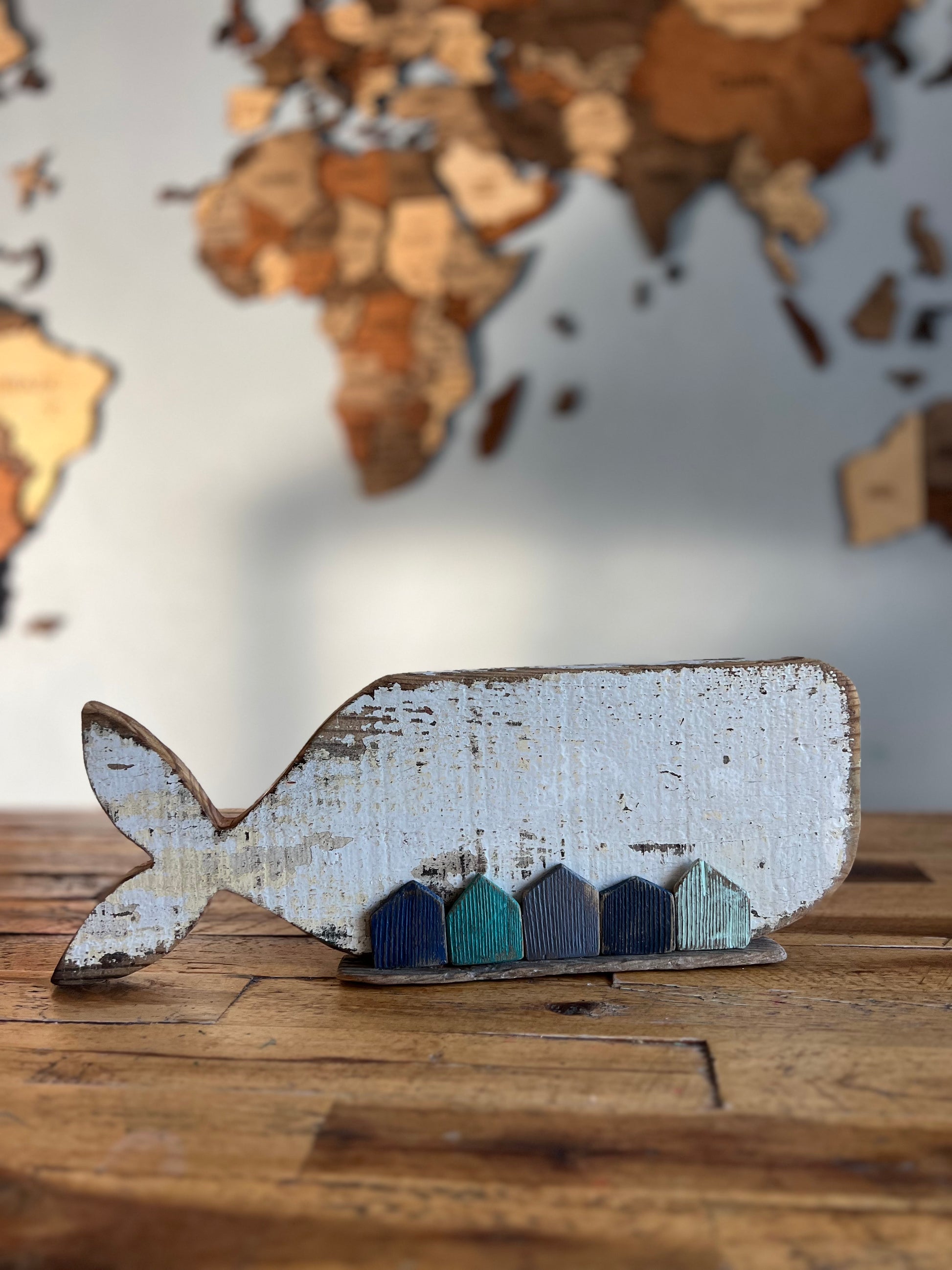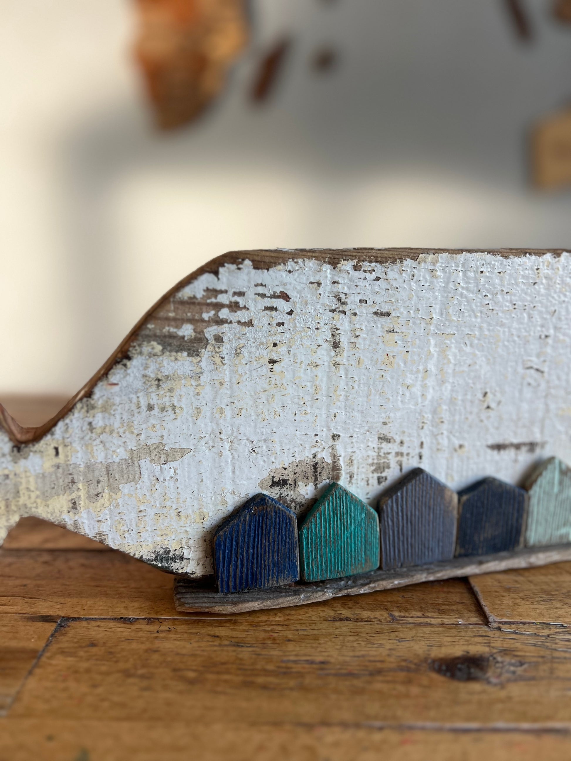 Handcrafted on Cape Cod from locally gathered driftwood, varnished, and waxed. I don’t pre-draw the shape—the driftwood reveals the whale hidden by the ocean. Each piece tells its own story, choosing the perfect lighthouses and houses.