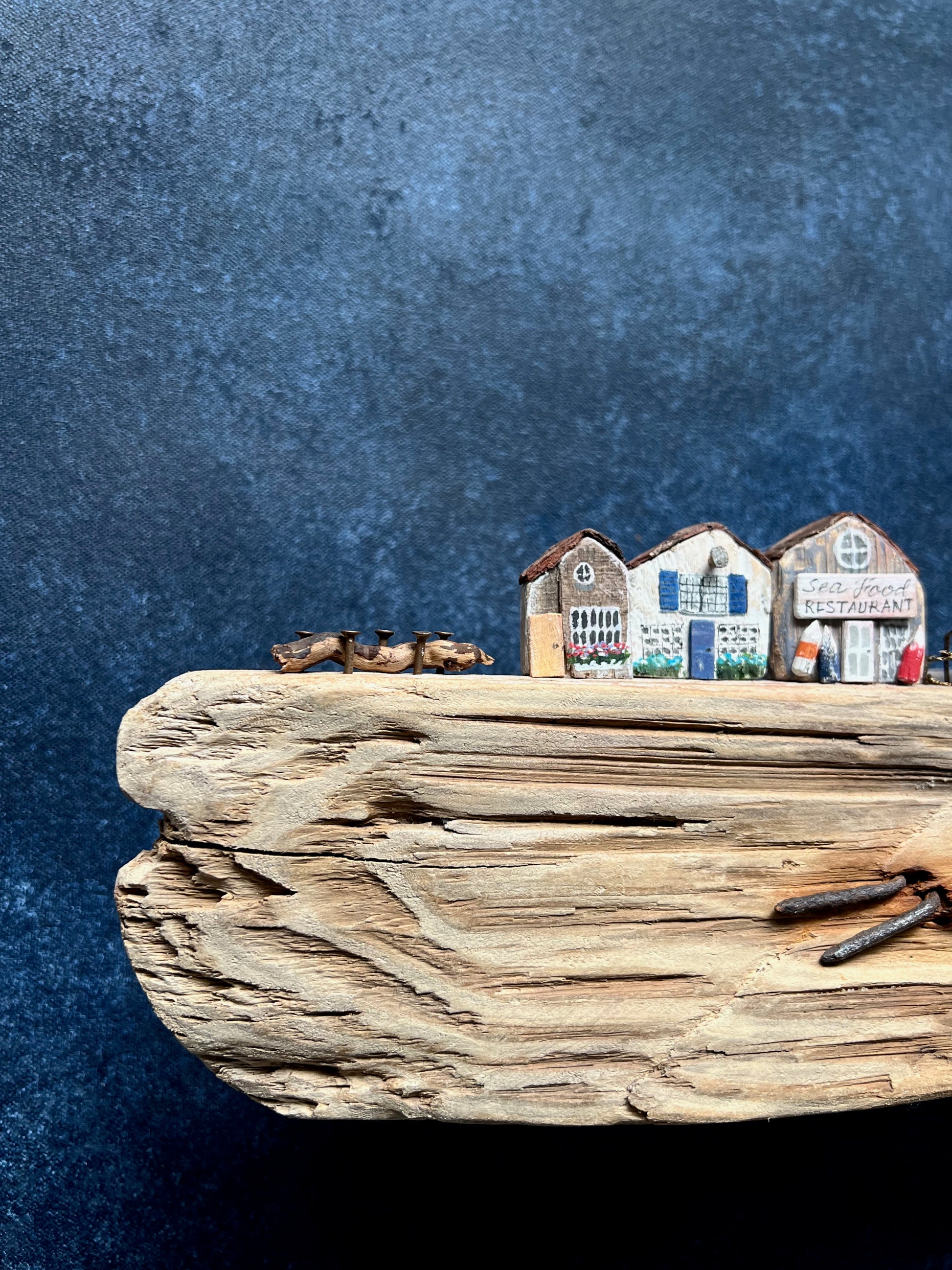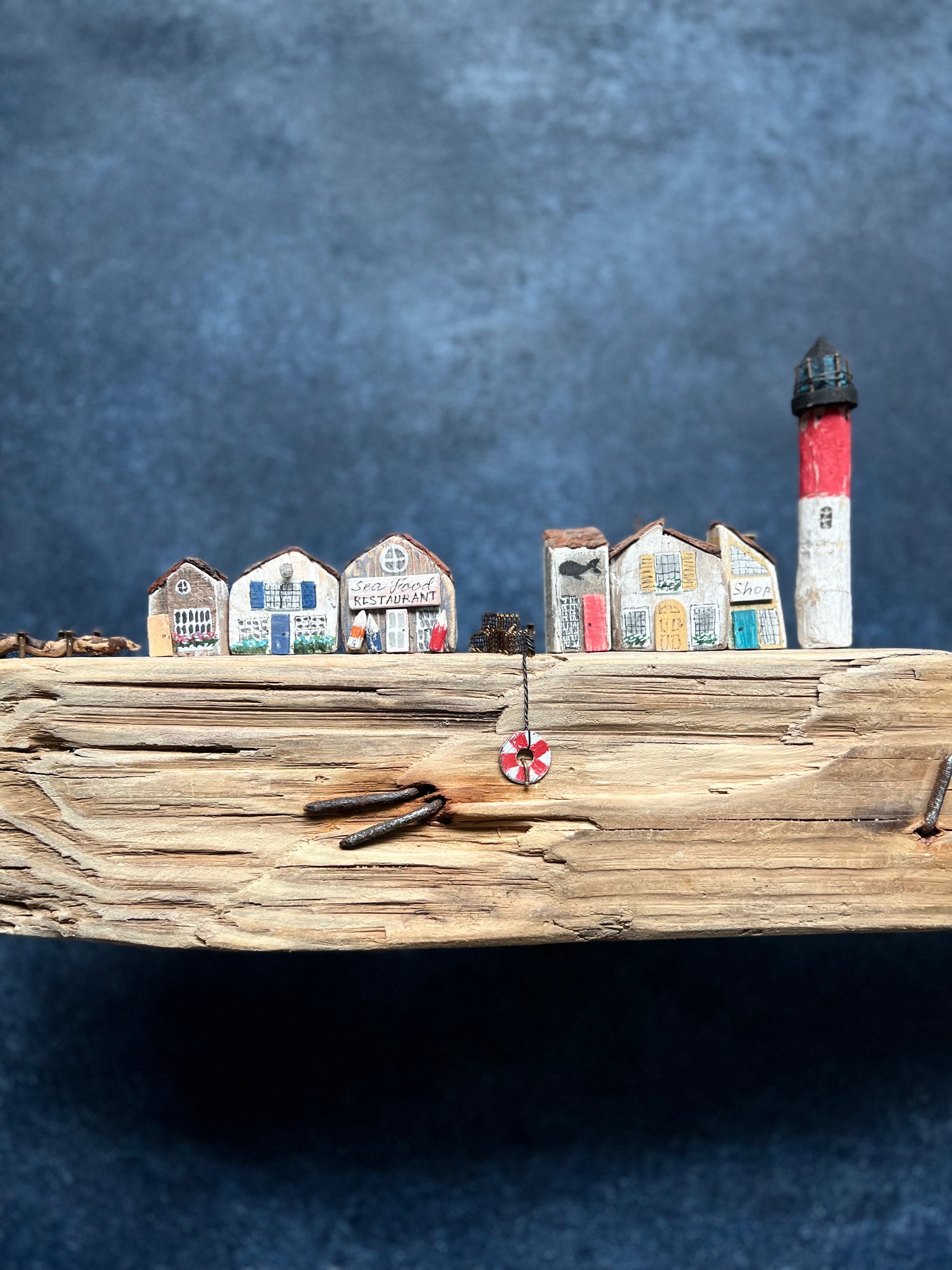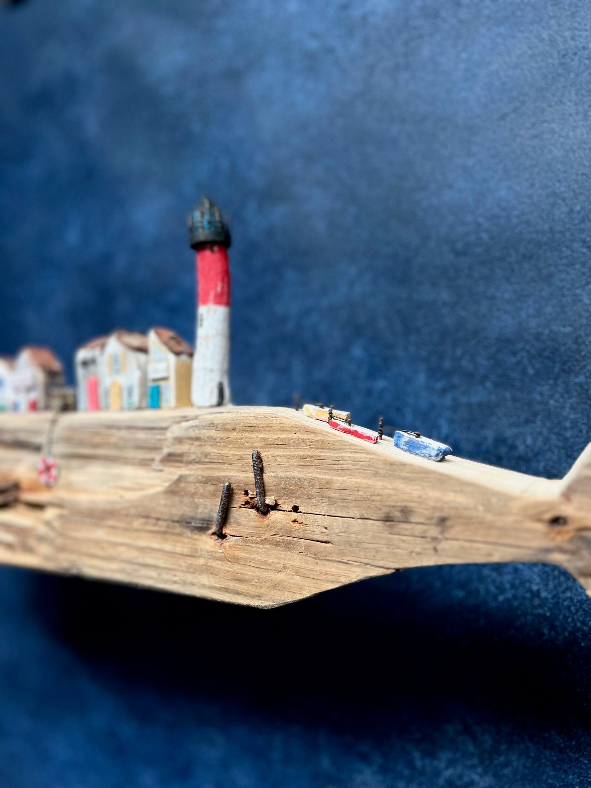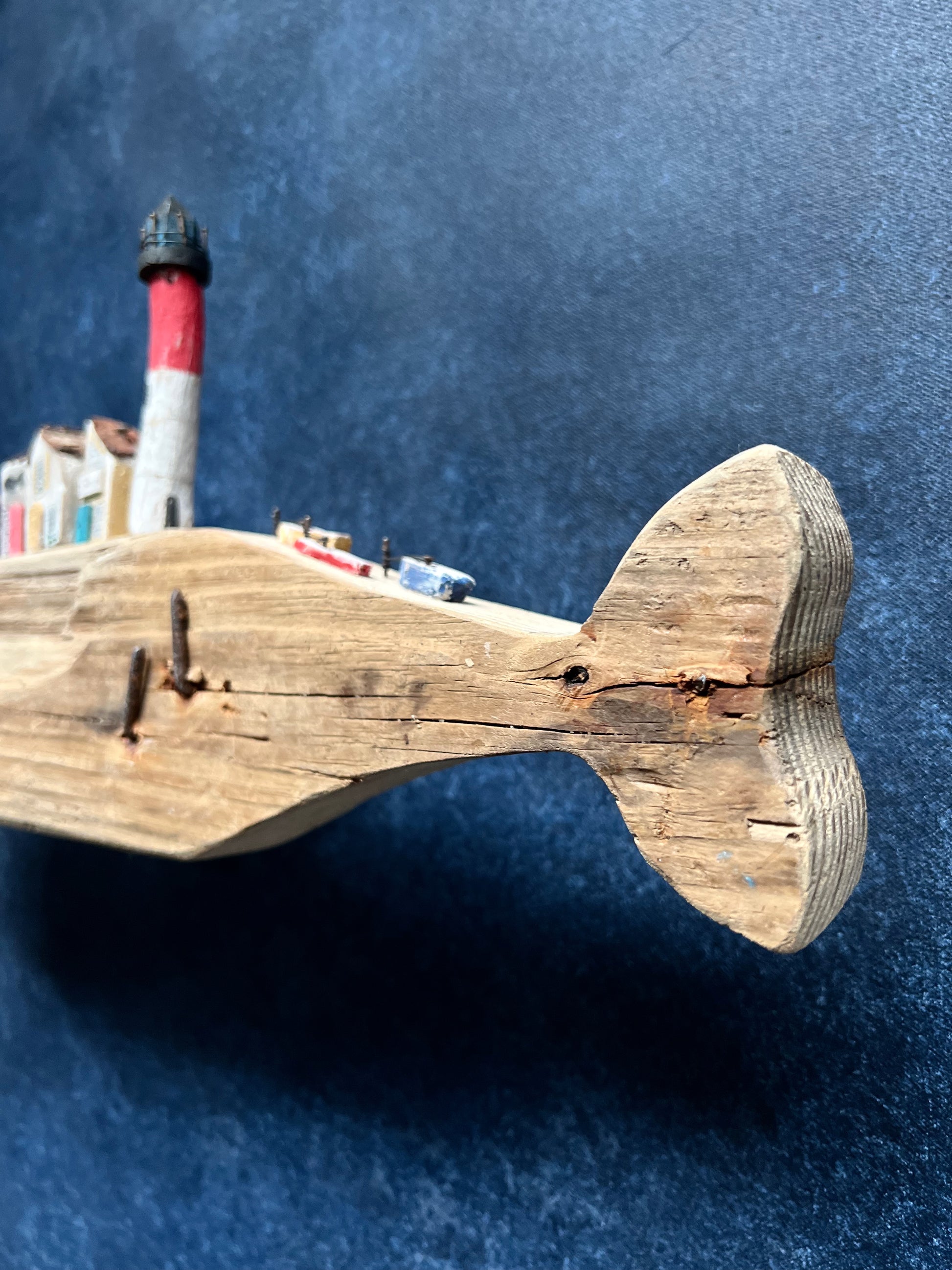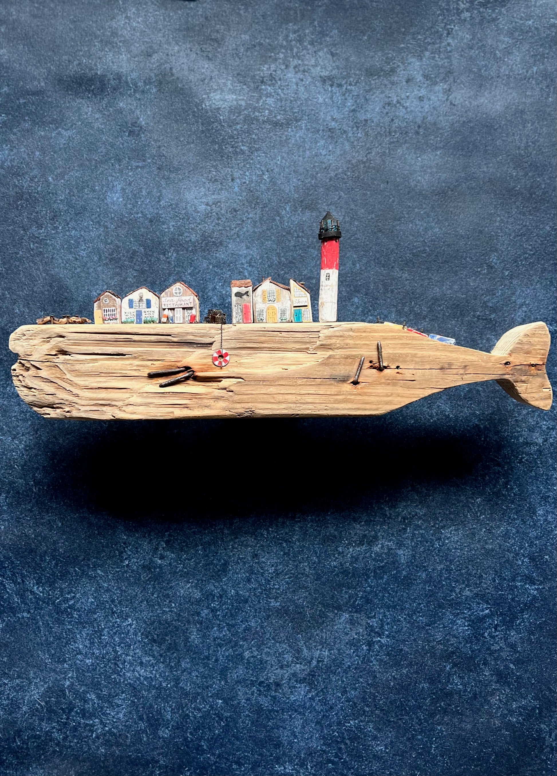 Handcrafted on Cape Cod from locally gathered driftwood, varnished, and waxed. I don’t pre-draw the shape—the driftwood reveals the whale hidden by the ocean. Each piece tells its own story, choosing the perfect lighthouses and houses.